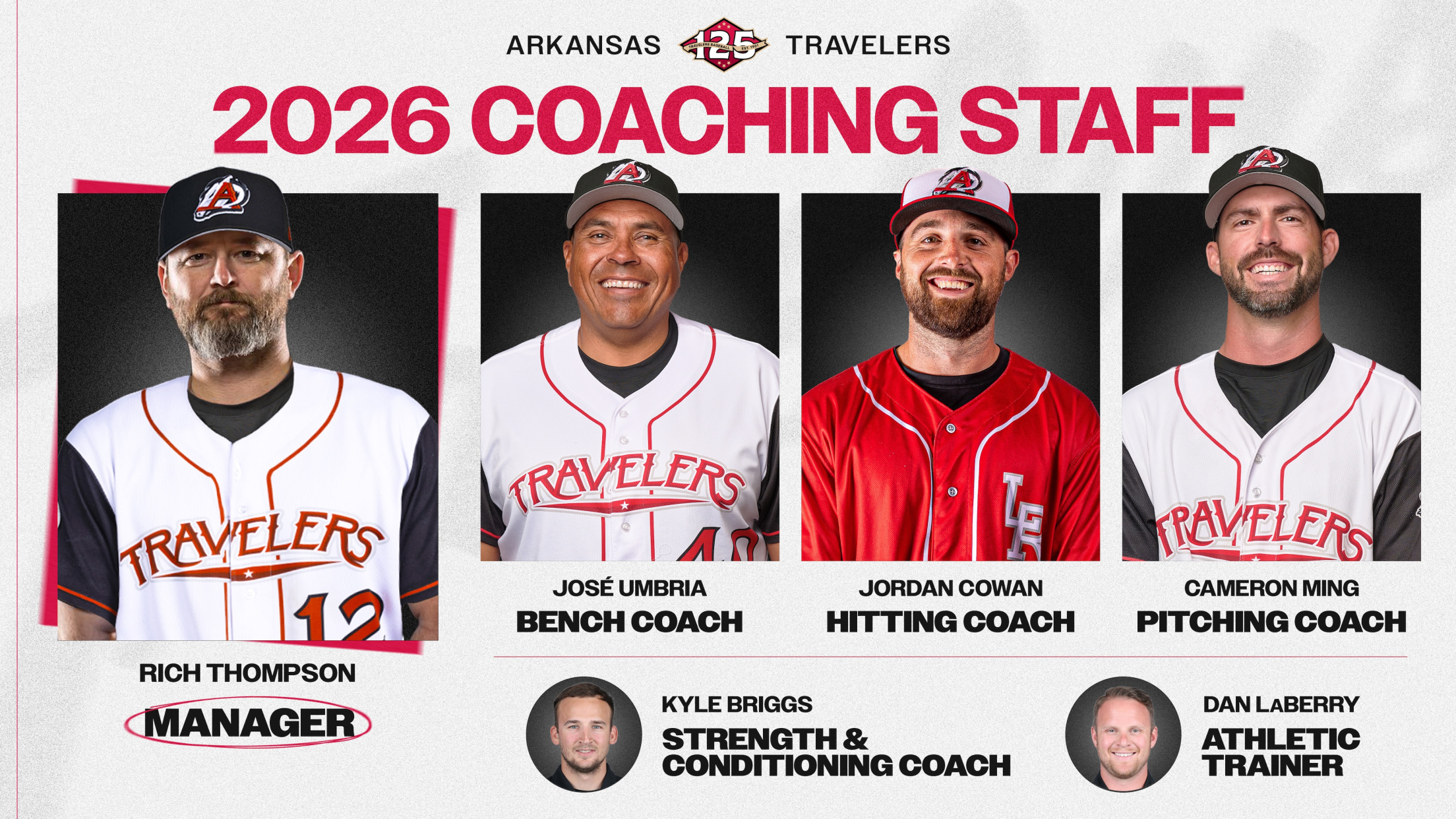 The Arkansas Travelers and their MLB parent club, the Seattle Mariners, are proud to reveal the Travelers coaching staff for the 2026 season, led by new Manager Rich Thompson. Thompson comes to the Travs after serving as the Head Baseball Coach and Athletic Director at National Park College in Hot