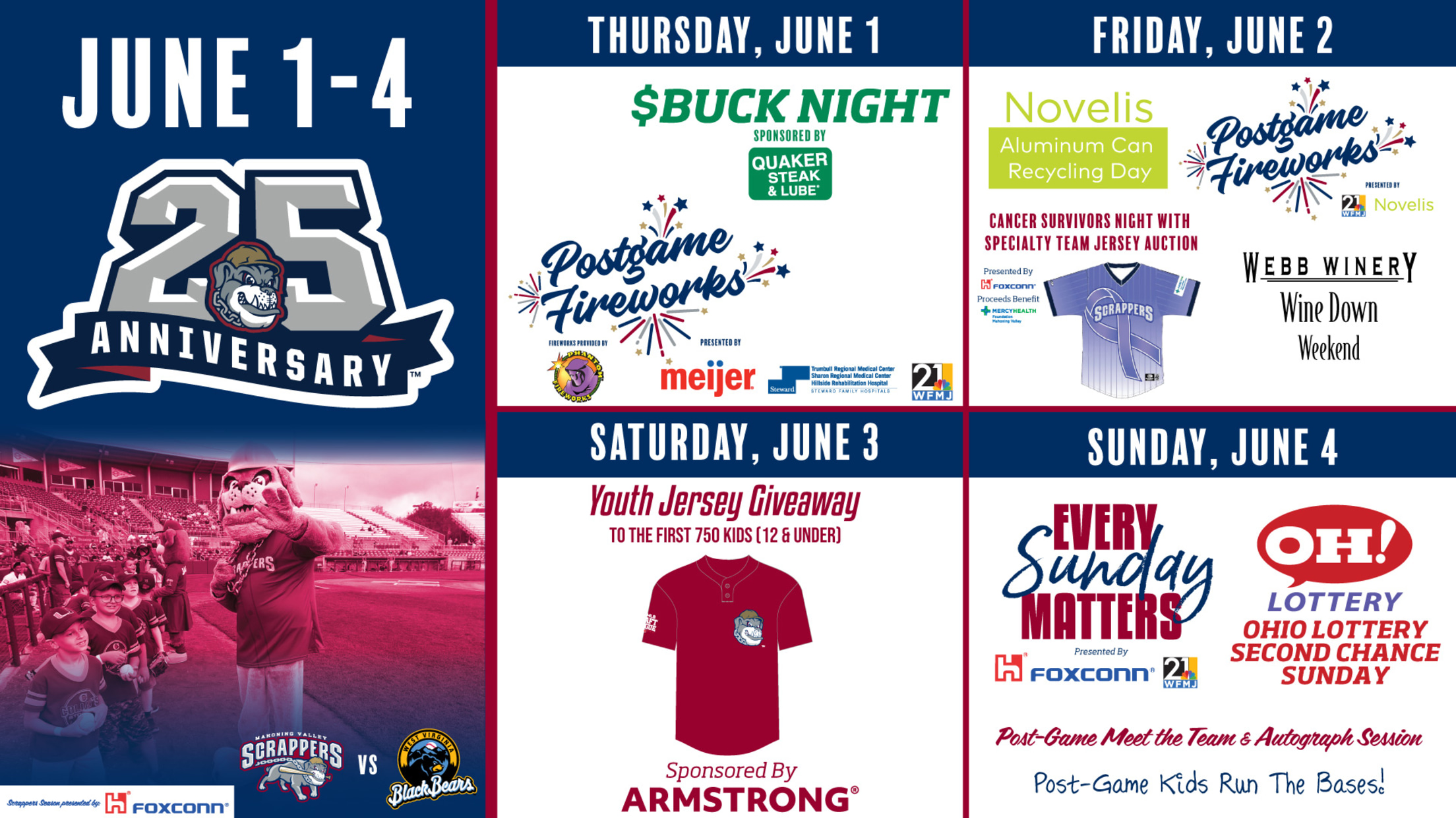 Every Sunday Matters presented by Foxconn and 21 WFMJ! Bring a donation of a non-perishable food items for the Second Harvest Food Bank or new children’s books for Akron Children’s Hospital Mahoning Valley and receive a FREE General Admission ticket to the game. It’s also an Ohio Lottery Second Chance Sunday - Buy one get one free tickets with any non-winning Ohio Lottery instant ticket. The first 100 fans 18+ will receive a seat cushion courtesy of Ohio Lottery. Fans will get the opportunity to meet the team and receive autographs after the game. Kids stick around after the game for kids run the bases.